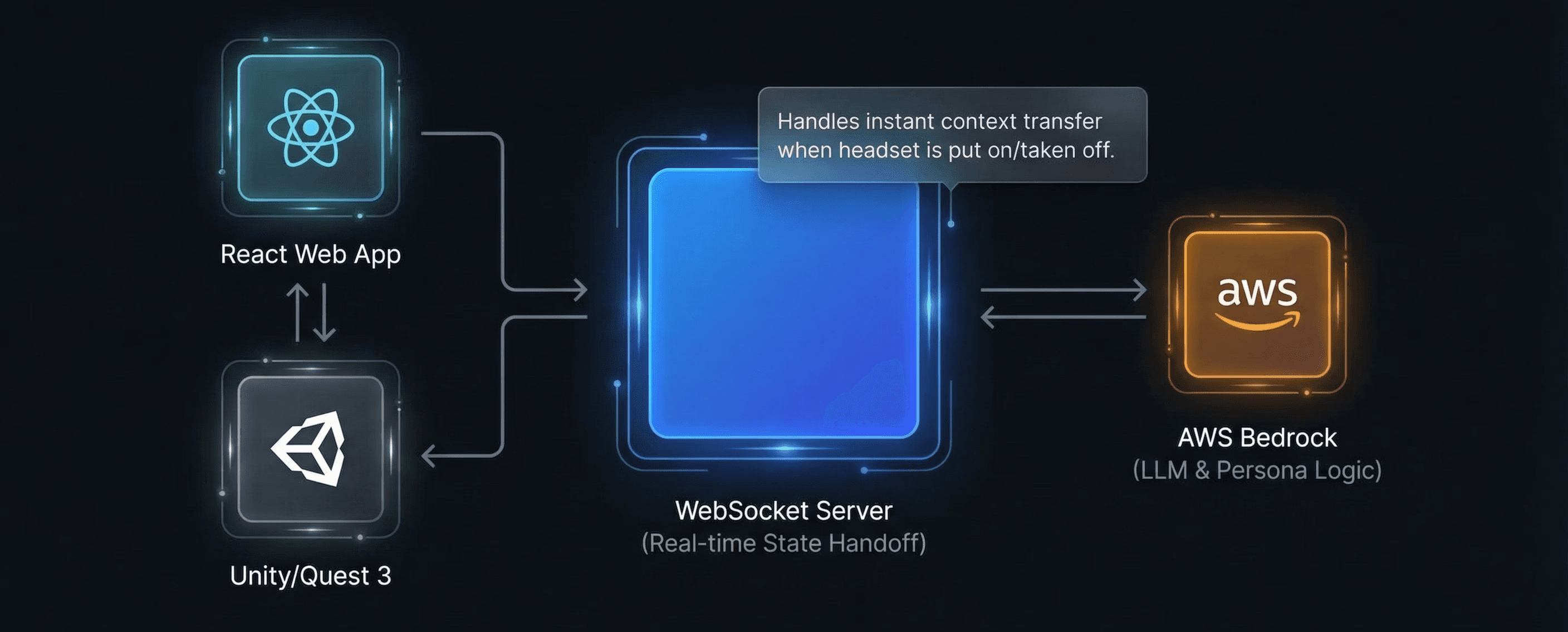 As a Spatial AI Design Technologist, my goal for Bondmate was to move beyond the 'chatbot' and create a persistent agent that inhabits the user's environment. Utilizing Amazon Bedrock, I engineered a multi-modal persona capable of maintaining context as users transitioned from 2D web dashboards to immersive Meta Quest 3 spaces.